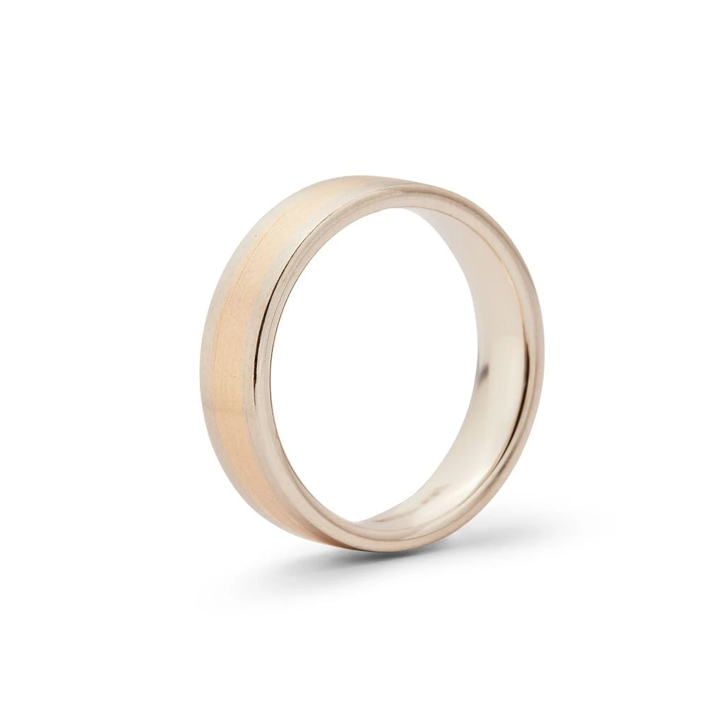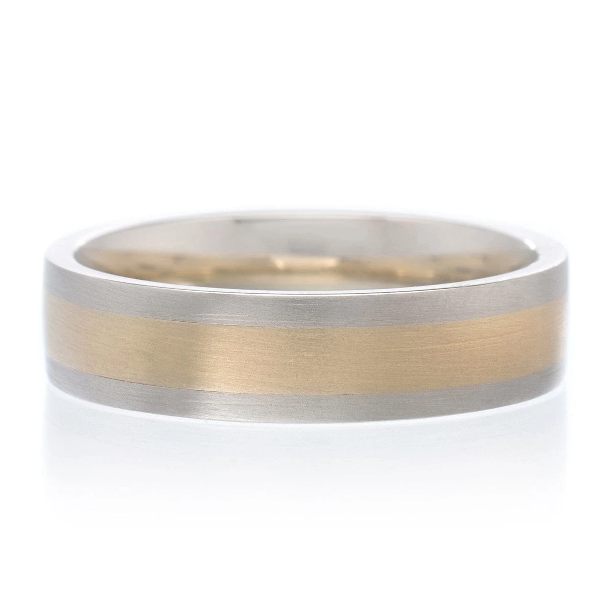 Satin finish flat profile band with a 14ky center and 14kw edges.