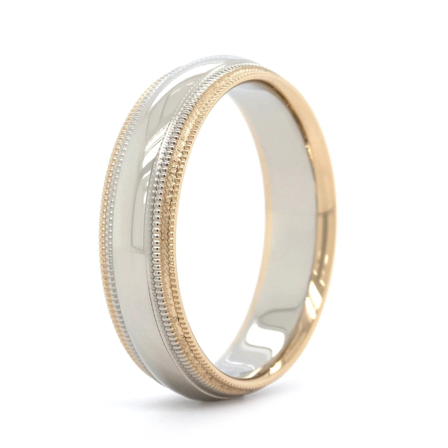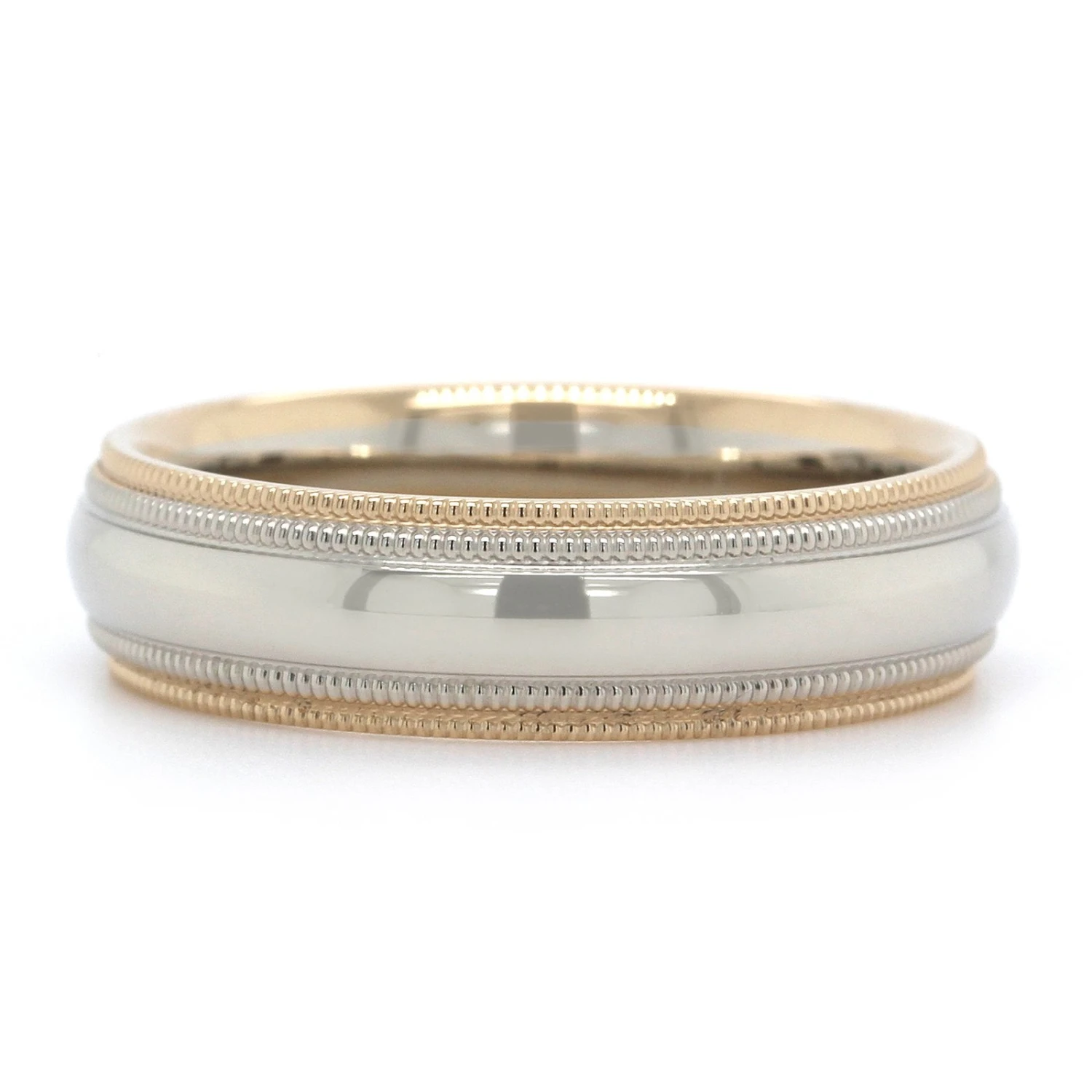 14k band with white high polished center with milgrain and yellow milgrain edges.