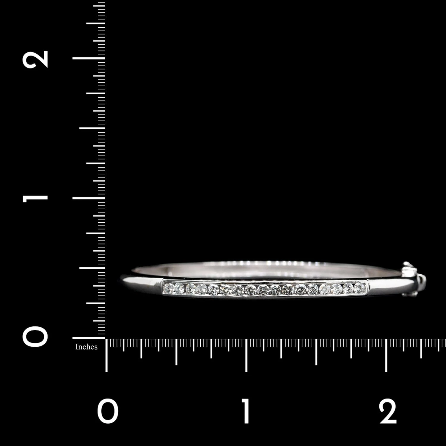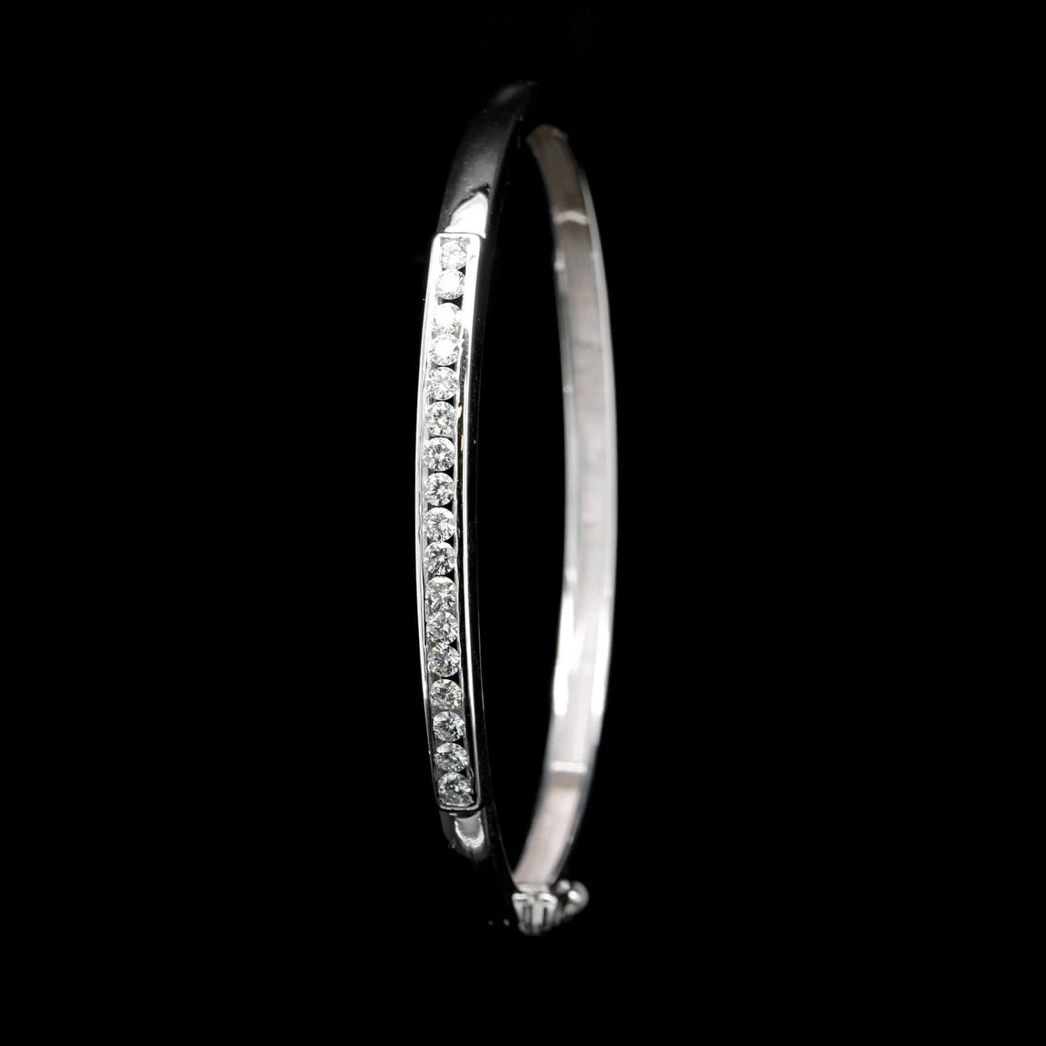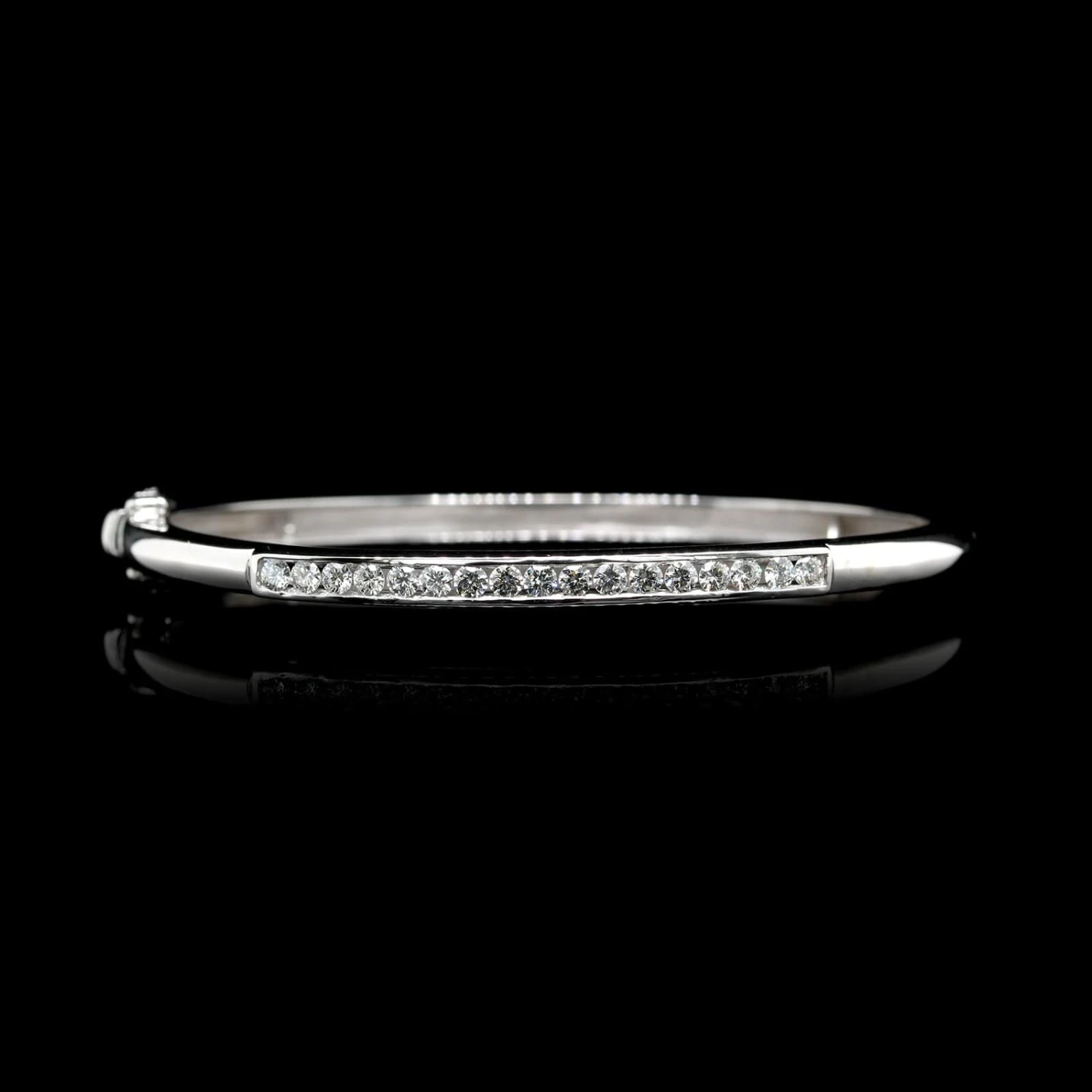 - The hinged bangle is set with 17 full cut diamonds, approx. .85cttw., H-I/SI