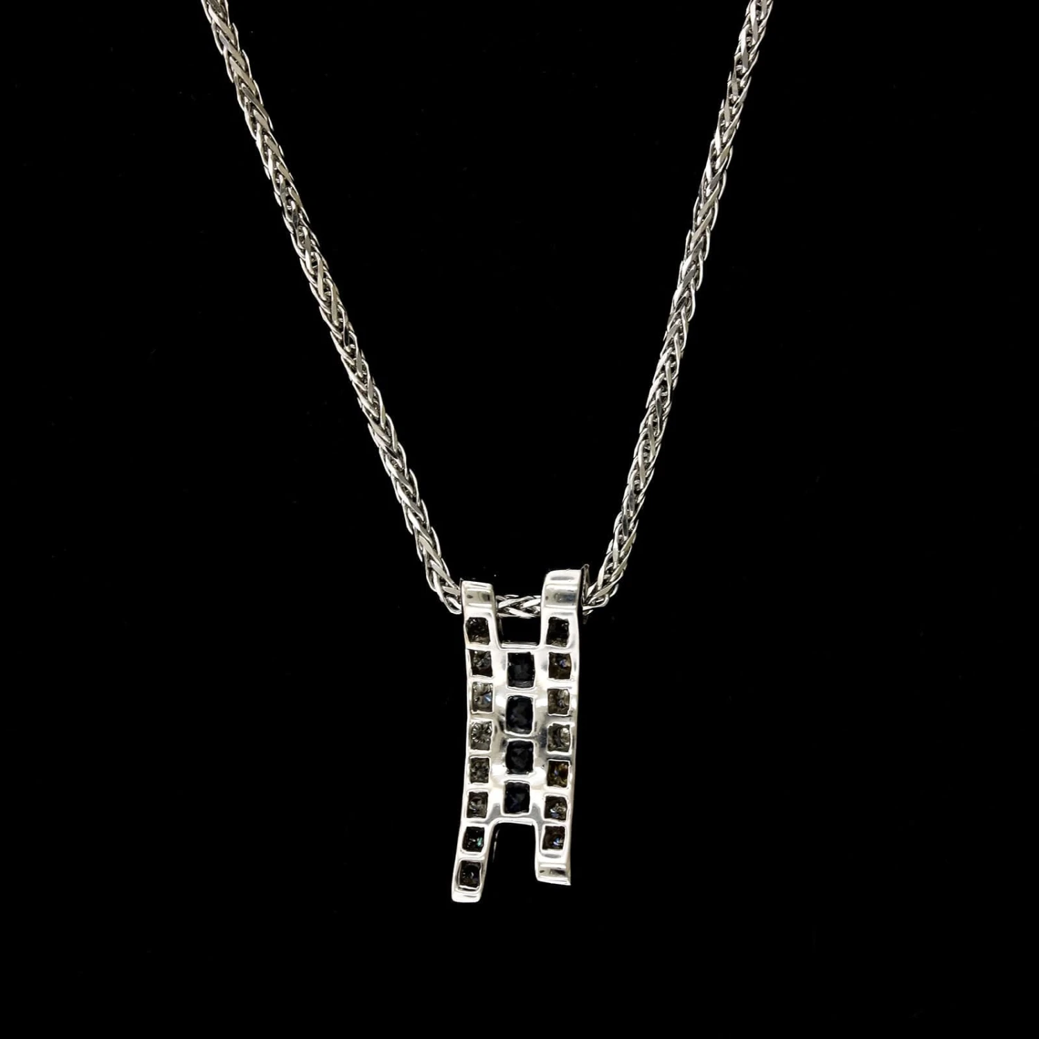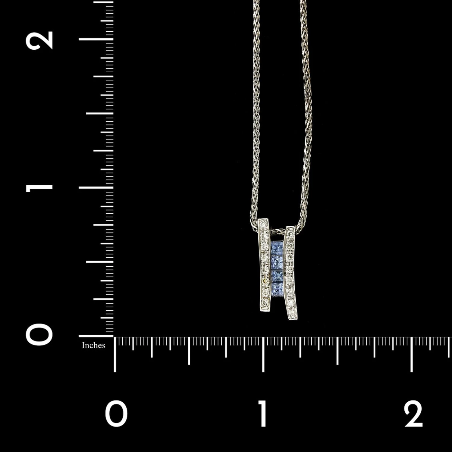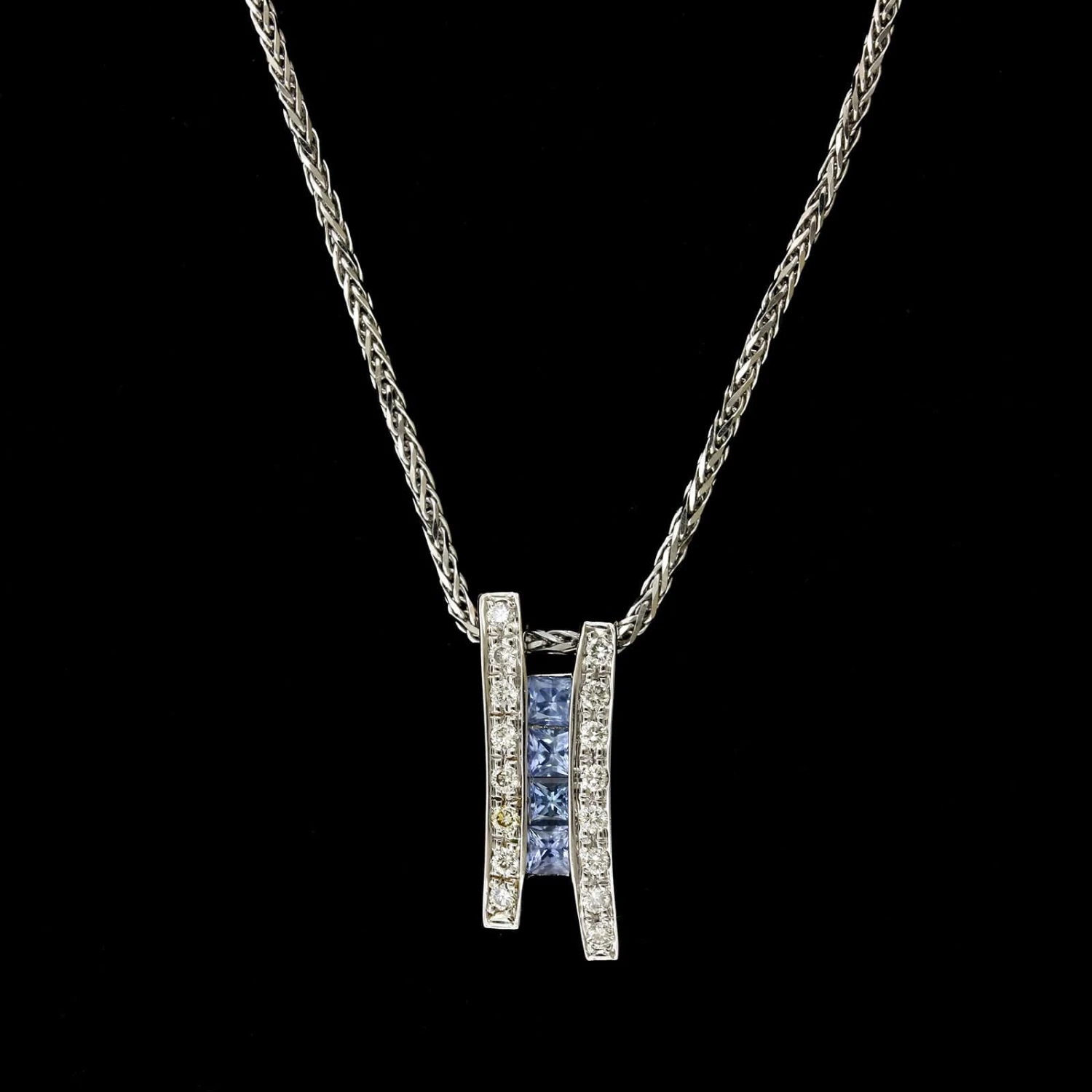 14K White Gold Sapphire Diamond Pendant. The pendant is set with four princess