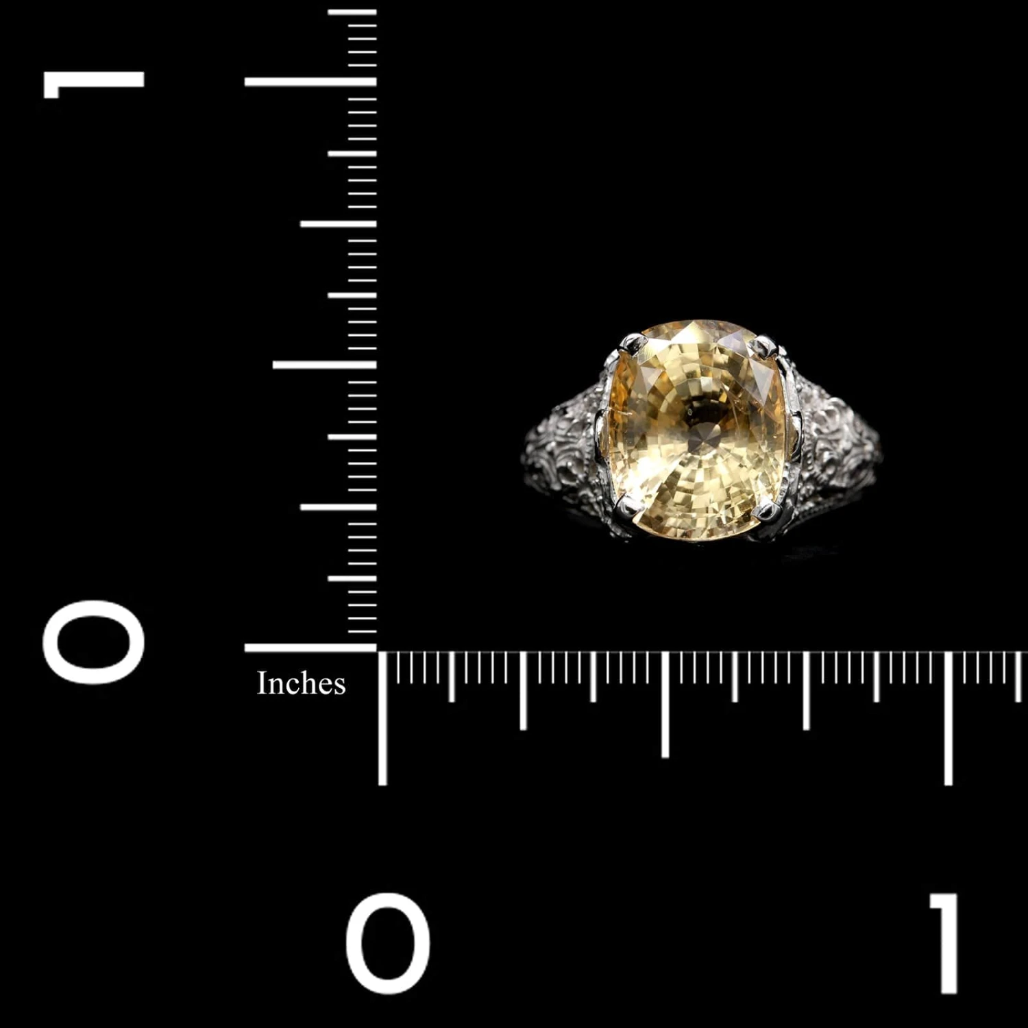 - The ring is set with one cushion cut yellow sapphire measuring 11.00mm x 8.80mm.