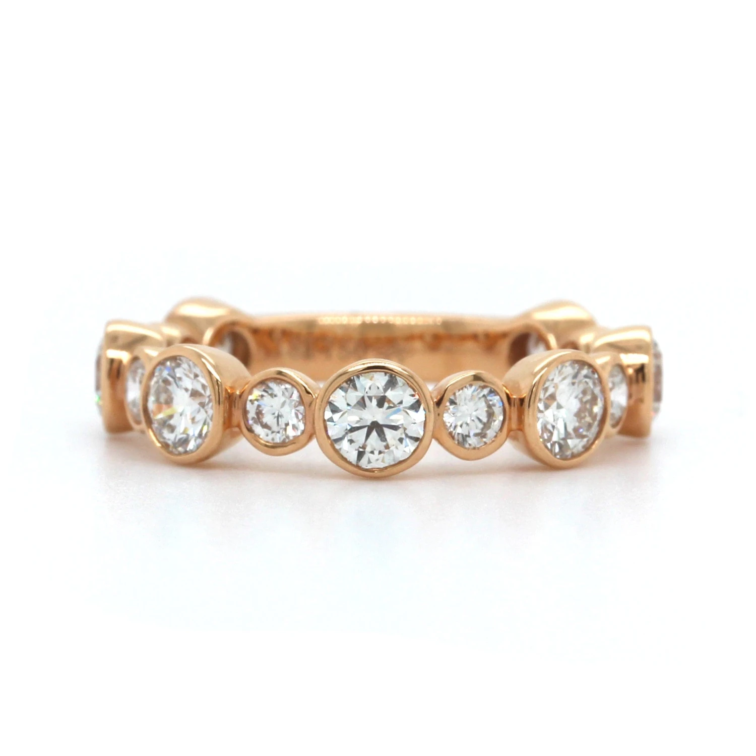 18k rose gold band with bezel set round diamonds alternating small round diamonds and large round diamonds.