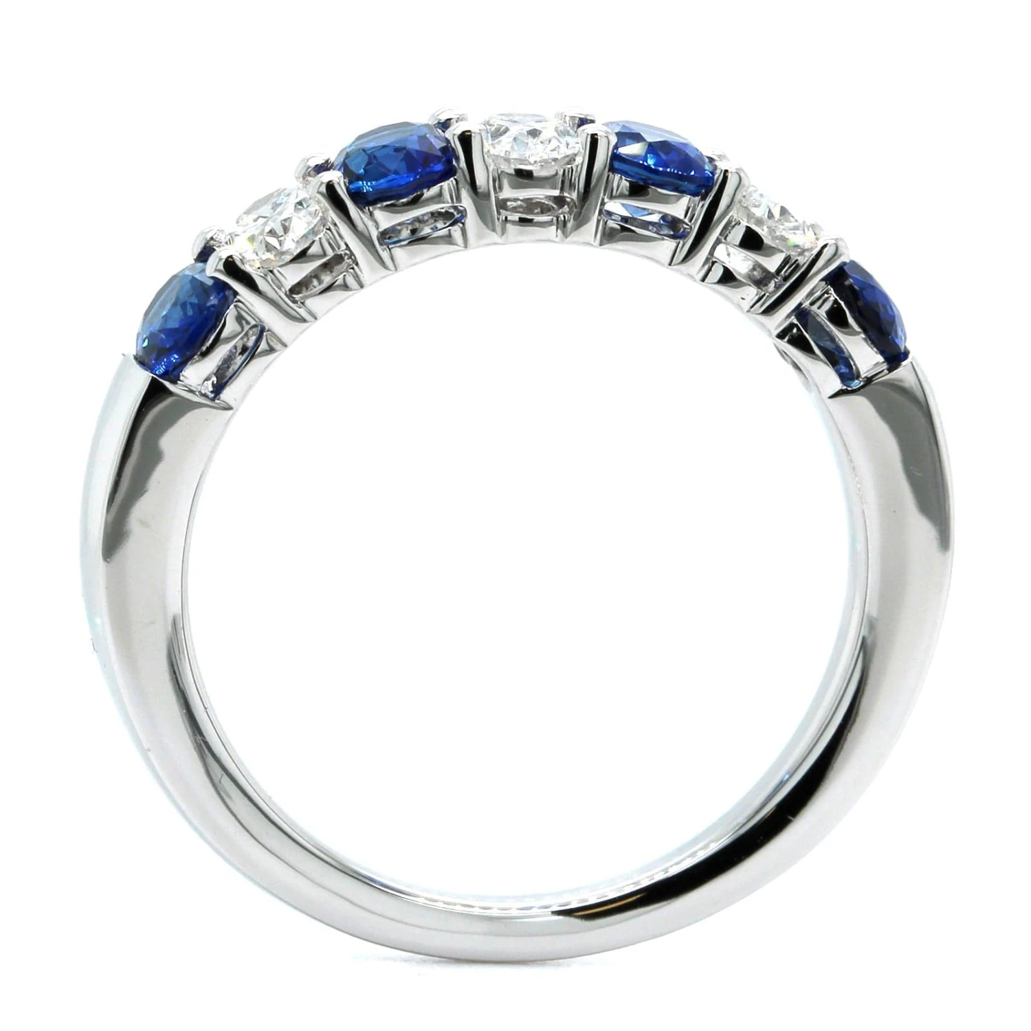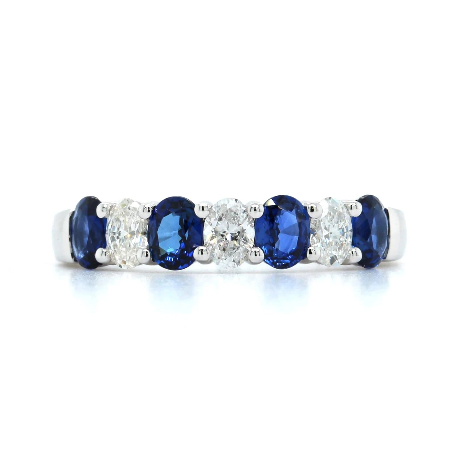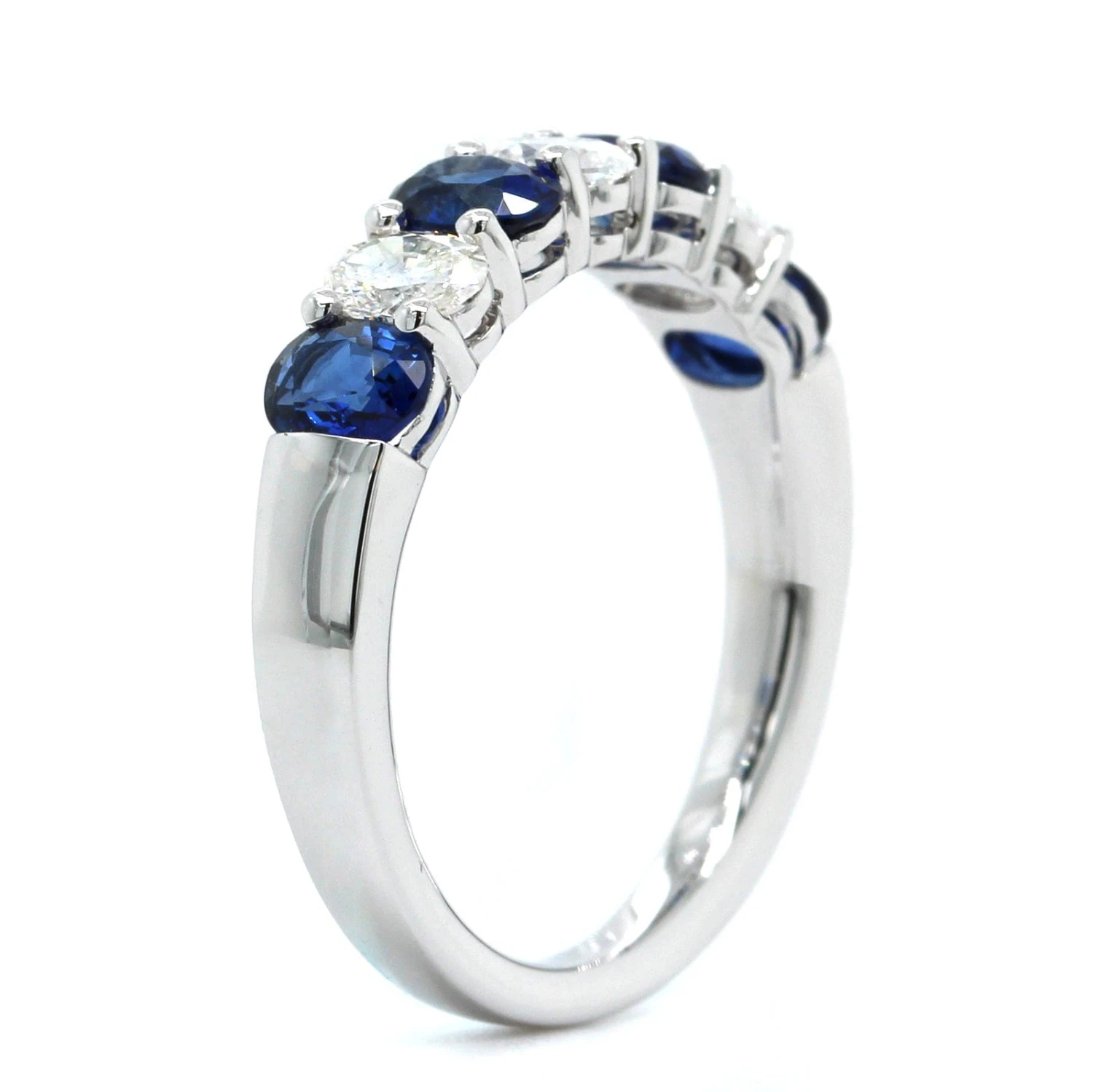 18k white gold shared prong band with 4 oval blue sapphires and 3 oval diamonds.
