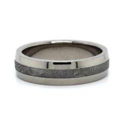 Gibeon meteorite ring, canopus pattern, wide channel and liner of 18k, palladium white gold, slightly rounded profile, comfort fit interior.