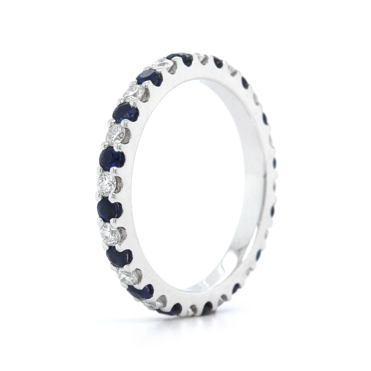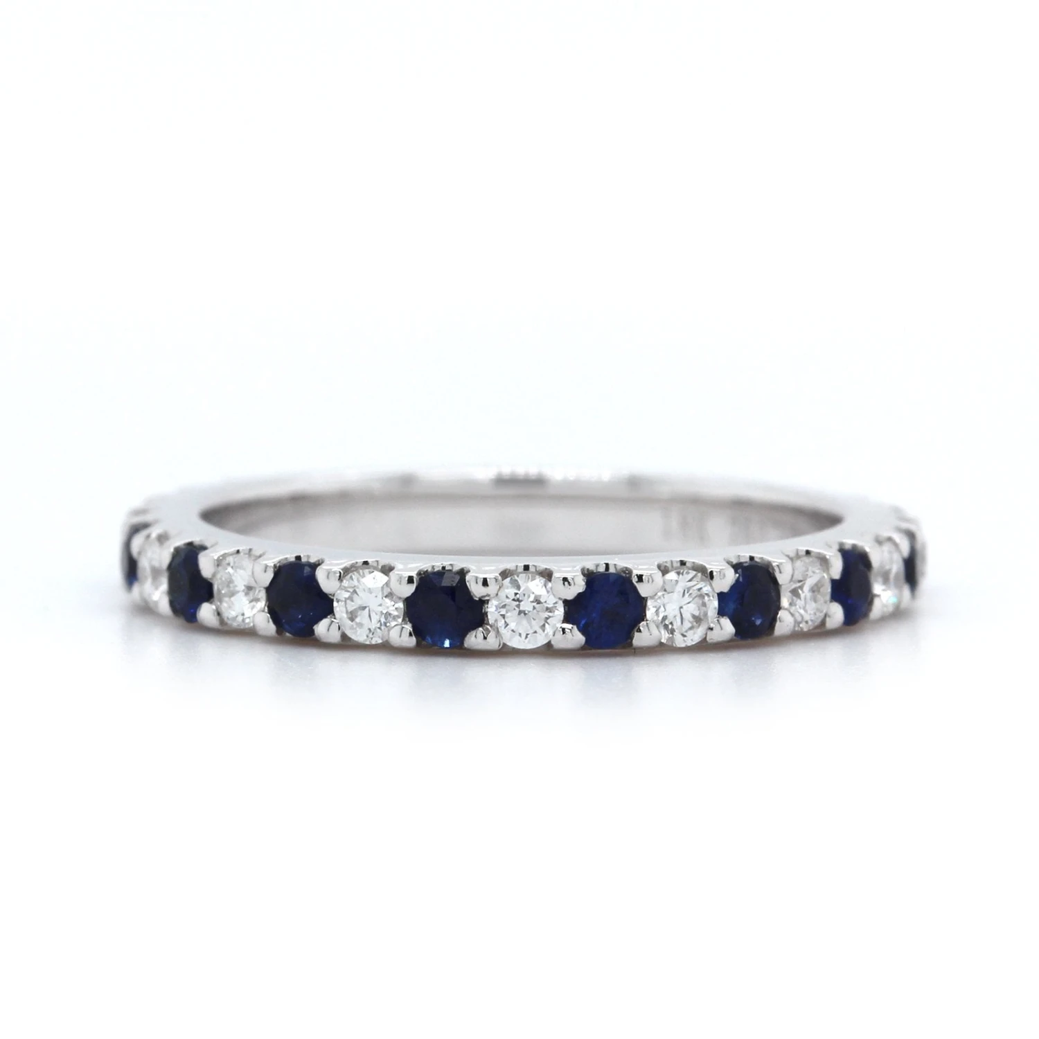 18k white gold shared prong eternity band alternating with round blue sapphires (16) and diamonds (16).
