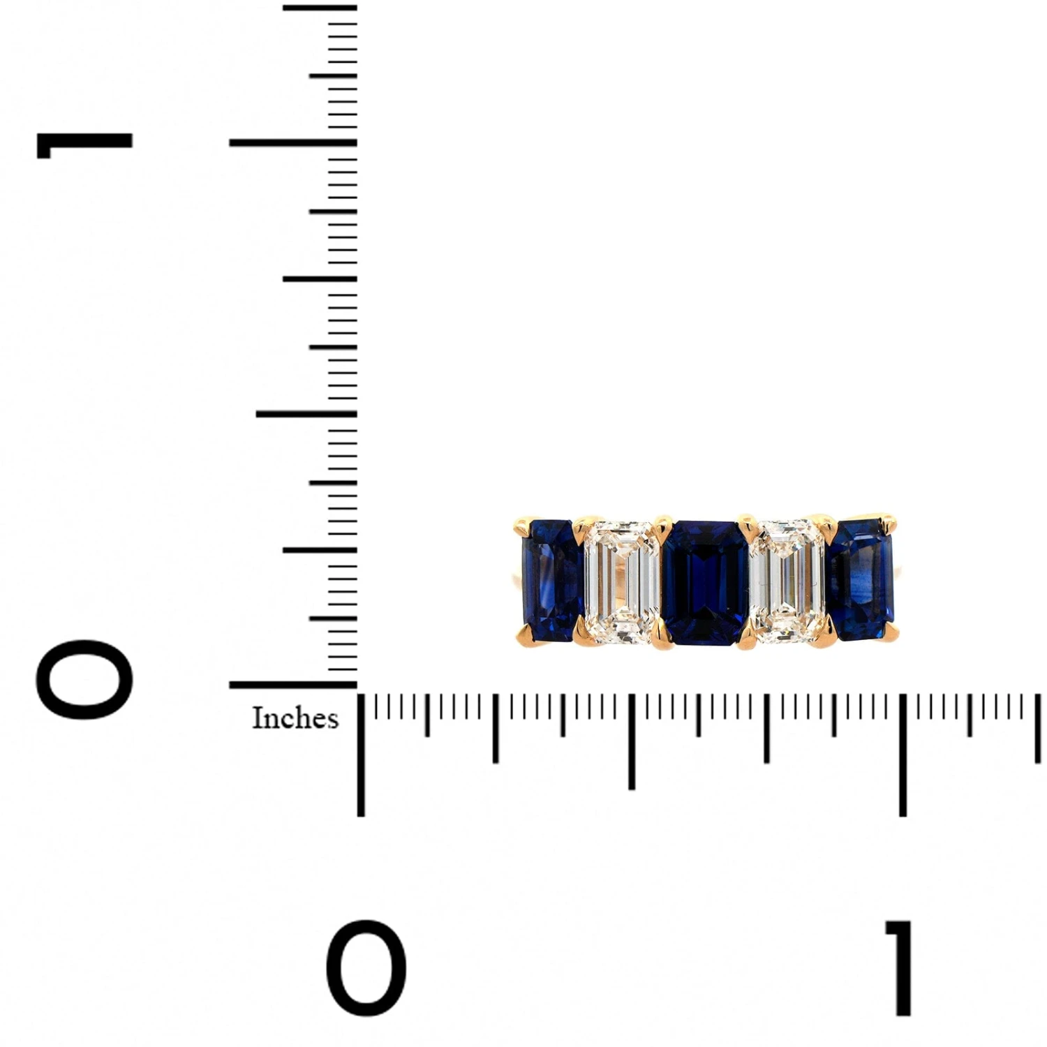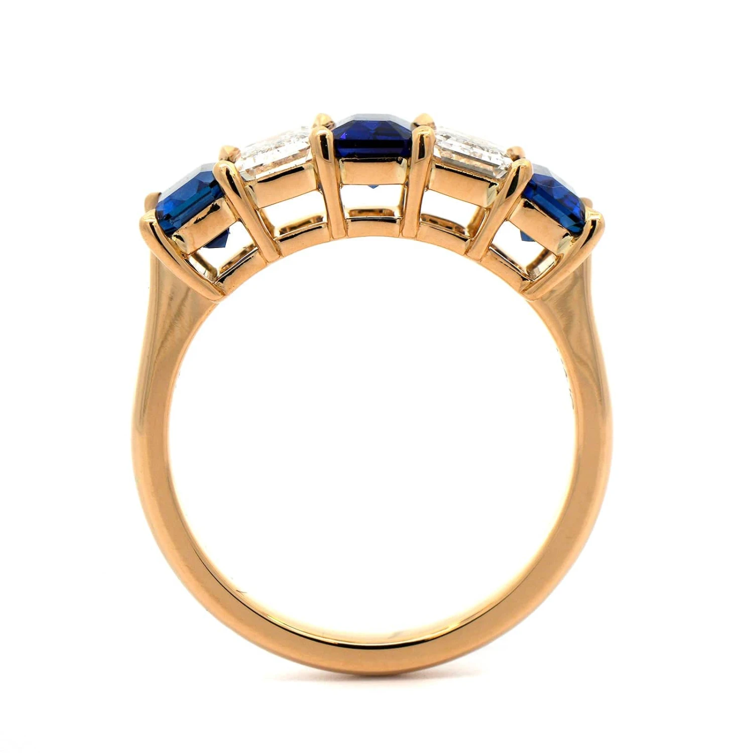 18k yellow gold shared prong ring featuring emerald cut blue sapphires and diamonds.