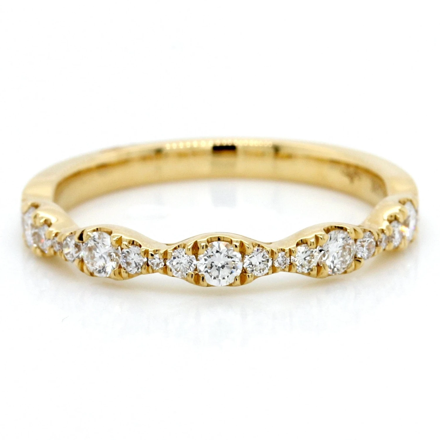 18k yellow gold prong set band with round diamonds alternating in size halfway around.