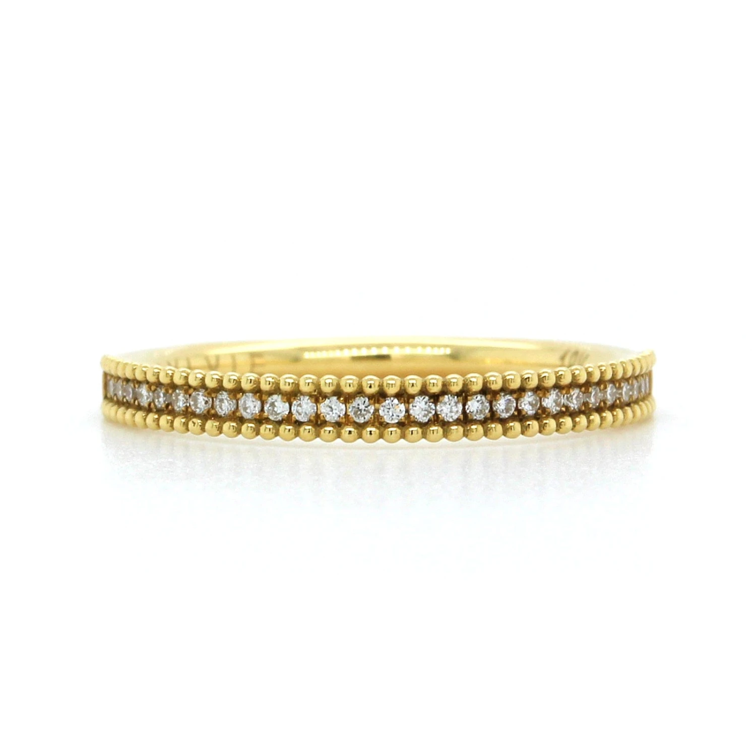 18k yellow gold bead set band with round diamonds halfway around with milgrain.