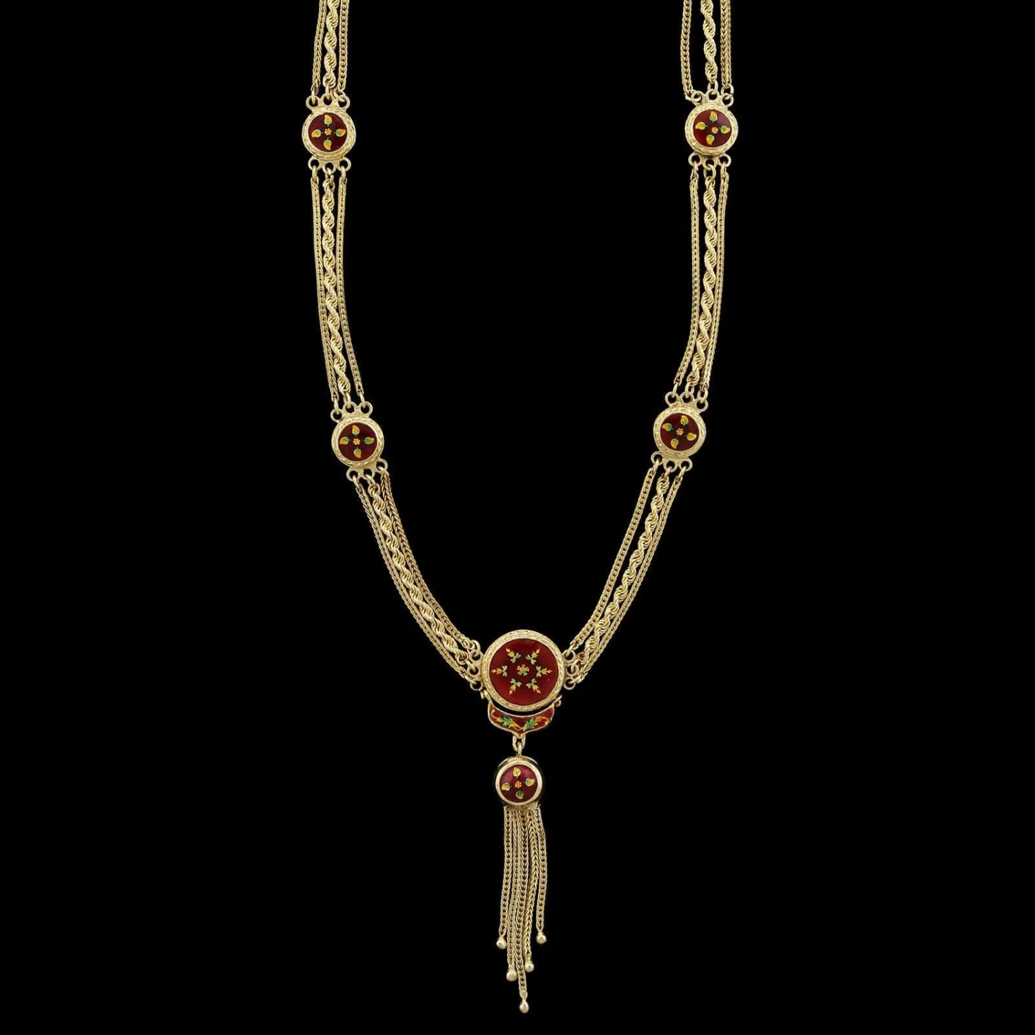 - 19K Yellow Gold Estate Enamel Tassel Reversible Necklace