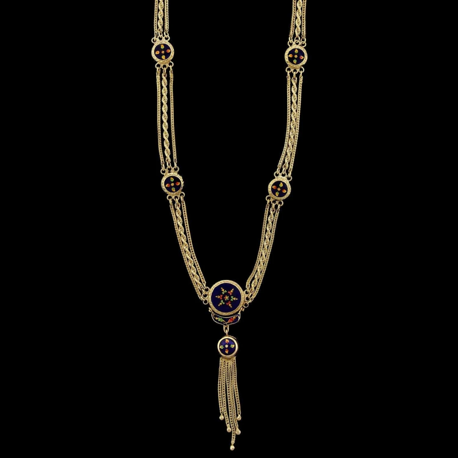- The necklace is designed as stations with various colored floral enamel accents