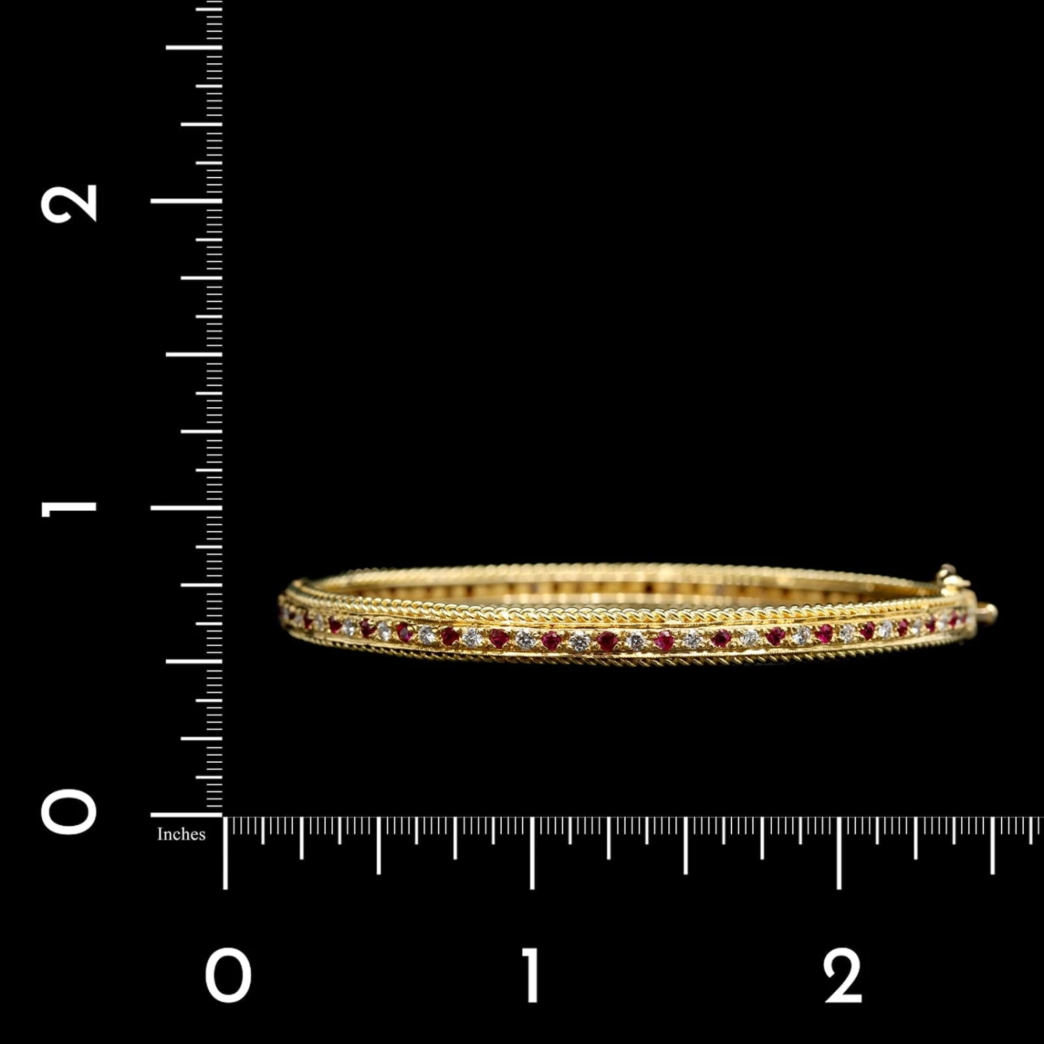 - The bracelet is a hinged bangle set with 38 round cut rubies, approx. 1.50cttw.,