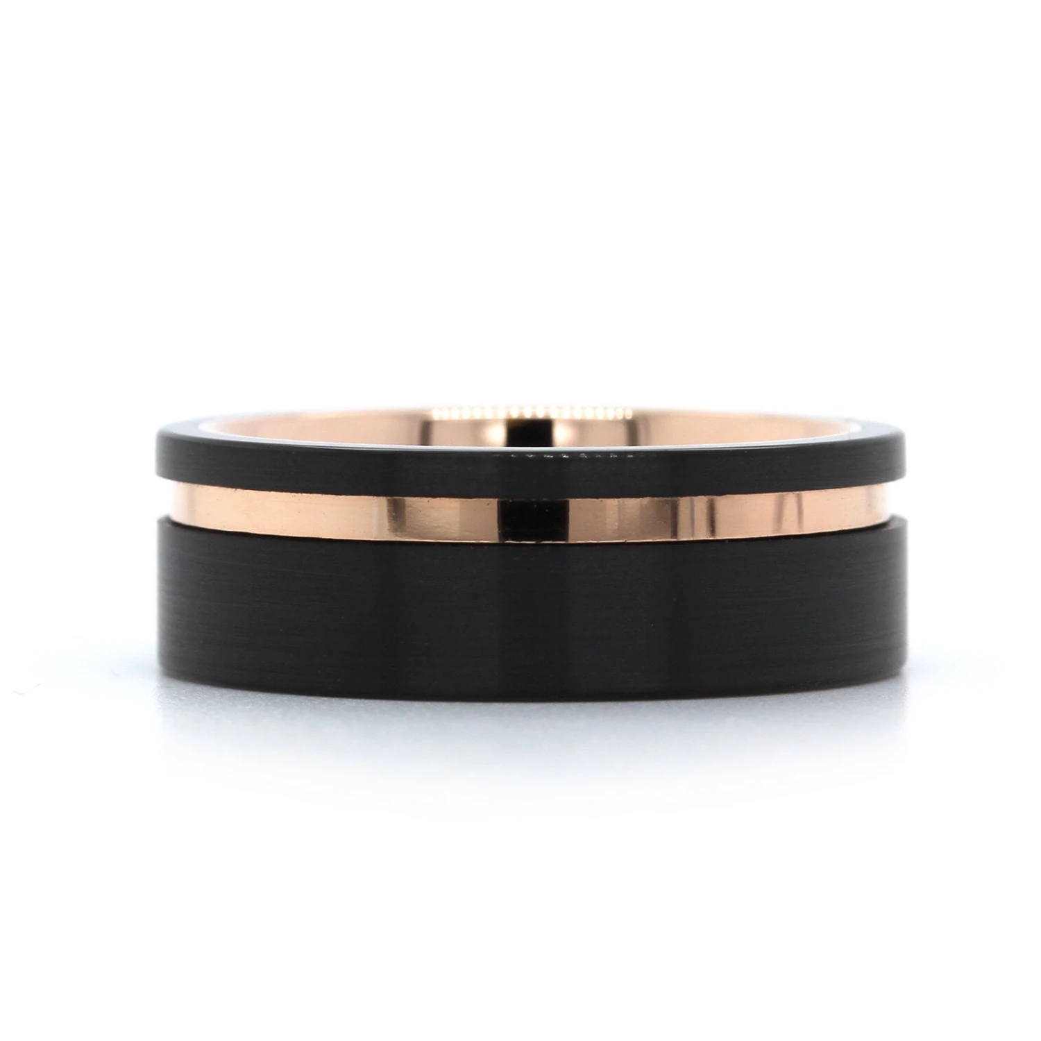 Tungsten band with high polished rose tungsten interior, stripe and black tungsten brushed finished exterior.