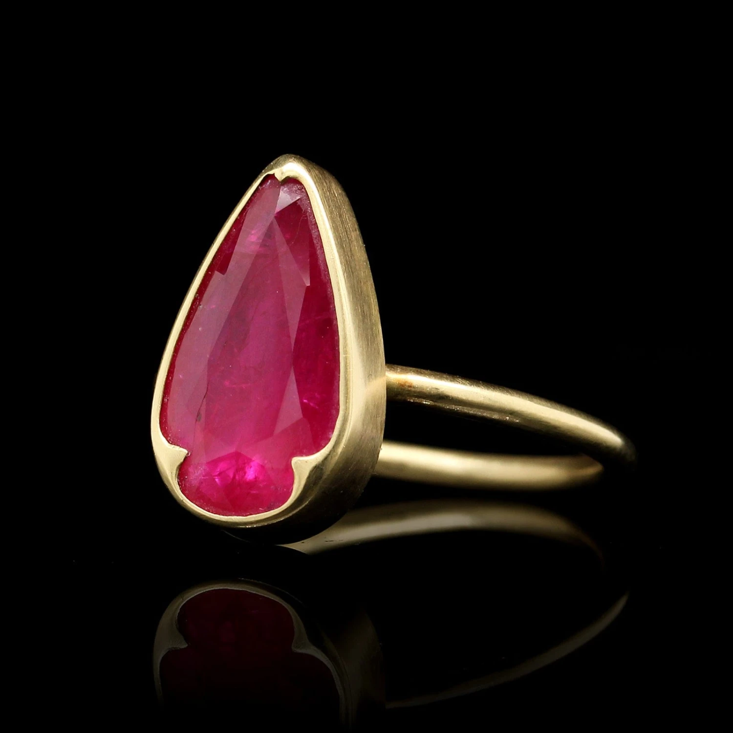 - The ring is set with one faceted cabochon pear shaped ruby
