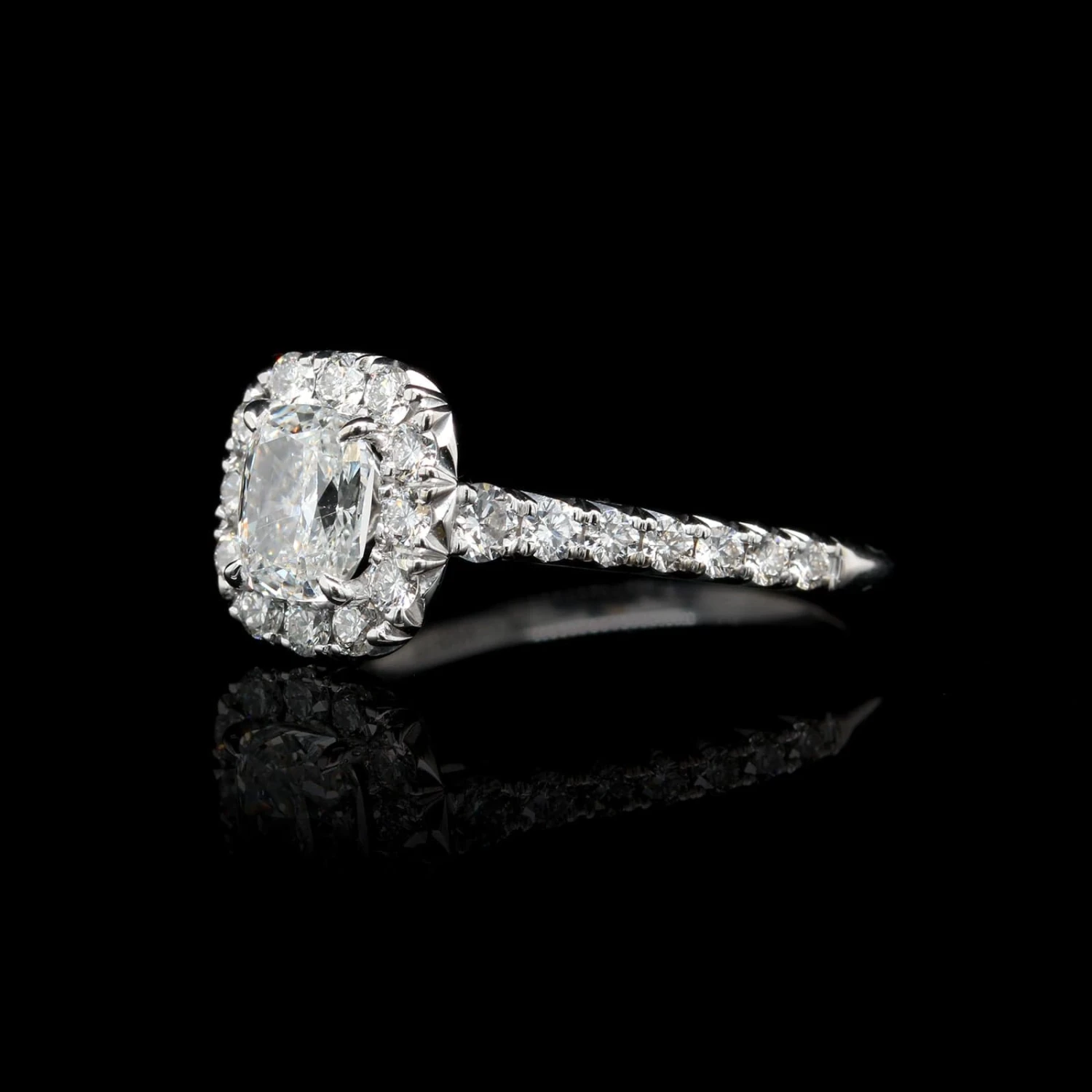 - The ring is set with a cushion cut diamond weighing .95cts. GIA report F/SI2,