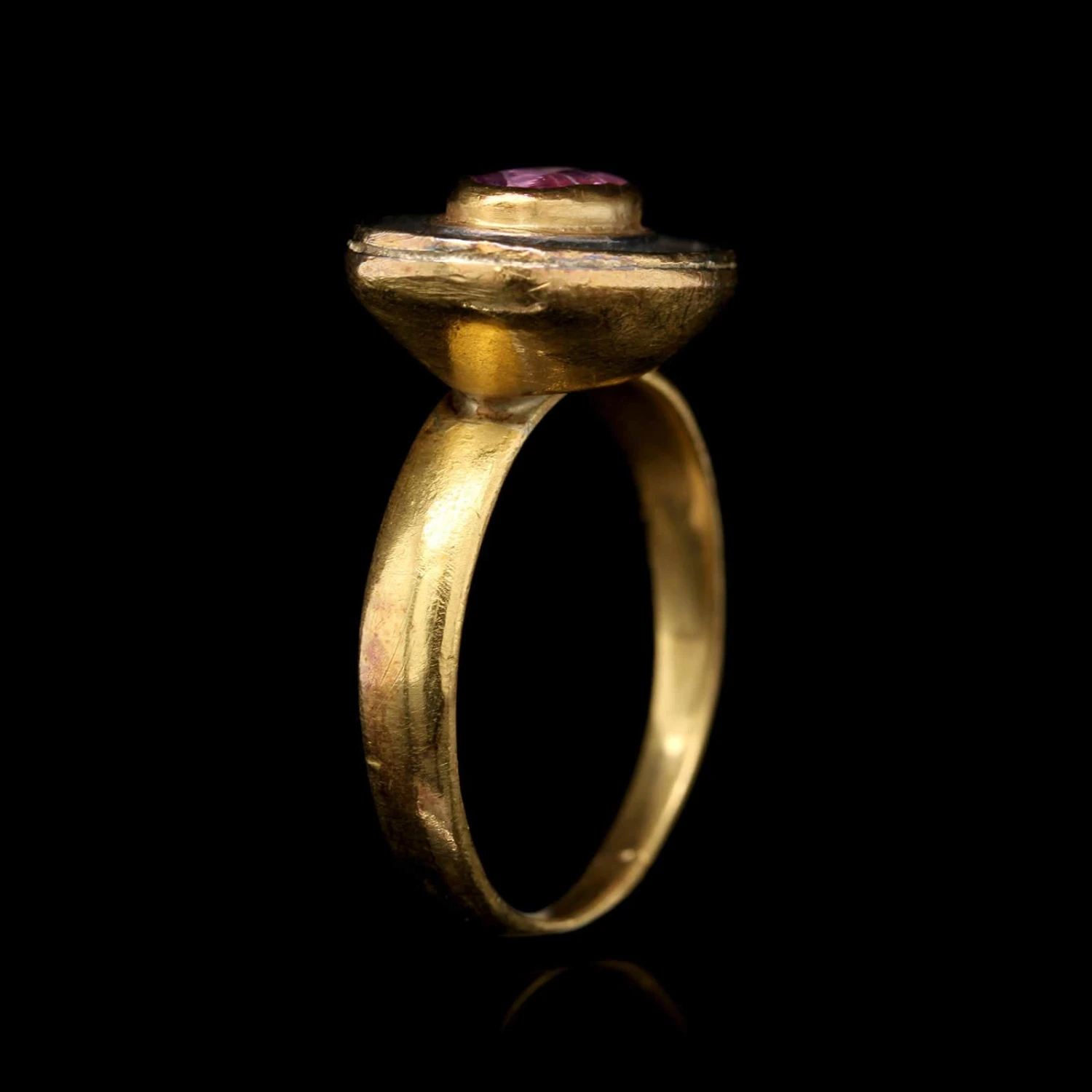 - The ring is bezel set with one cabochon pink sapphire framed by full cut diamonds