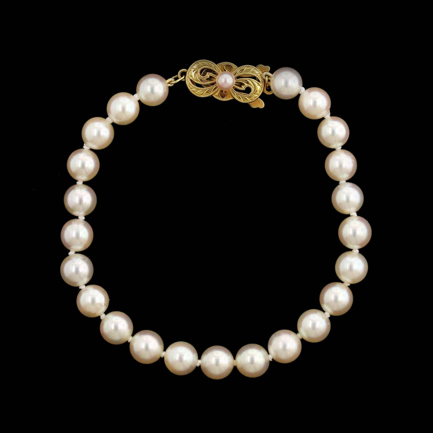 SKU: BG9UZ 7521637105799 Category: Bracelets Tags: Category: Estate Bracelet, Designer: Estate Mikimoto, Metal: Yellow Gold, New Estate, Nonsale, Price: $1000-$2500, Signed Estate Jewelry, Stone: Pearl
