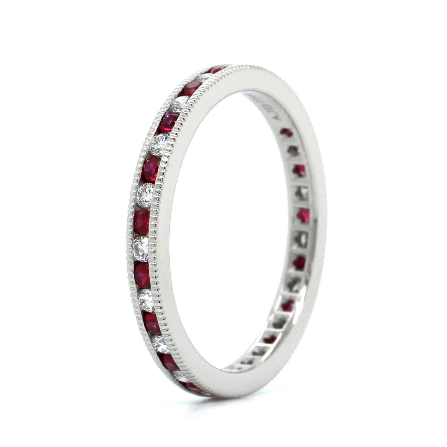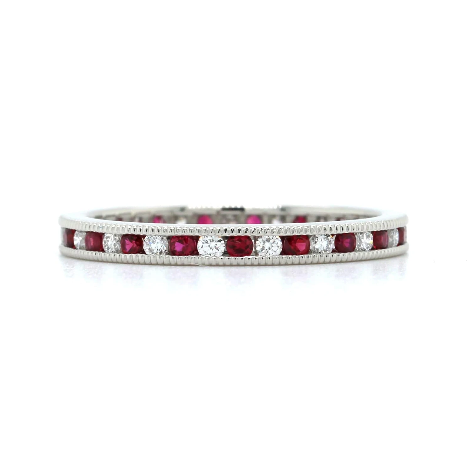 Platinum channel set eternity band alternating round cut rubies and diamonds.