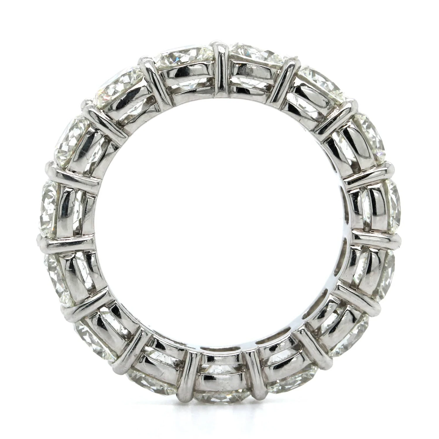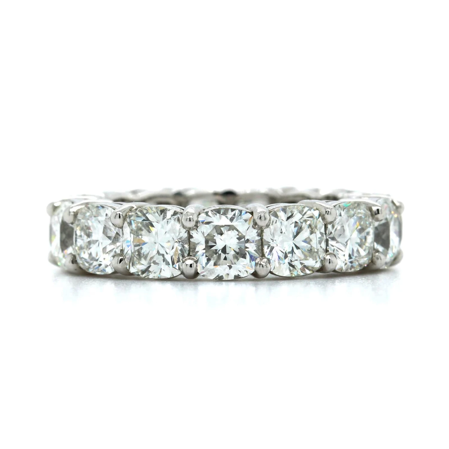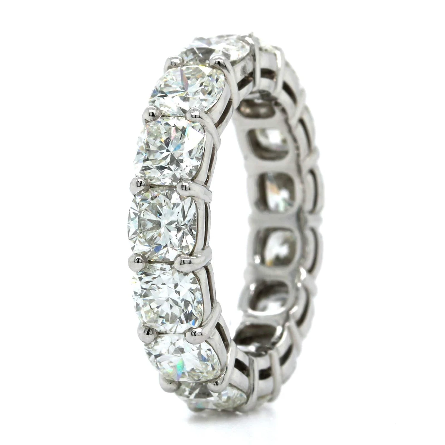 Platinum shared prong eternity band with 15 cushion cut diamonds.
