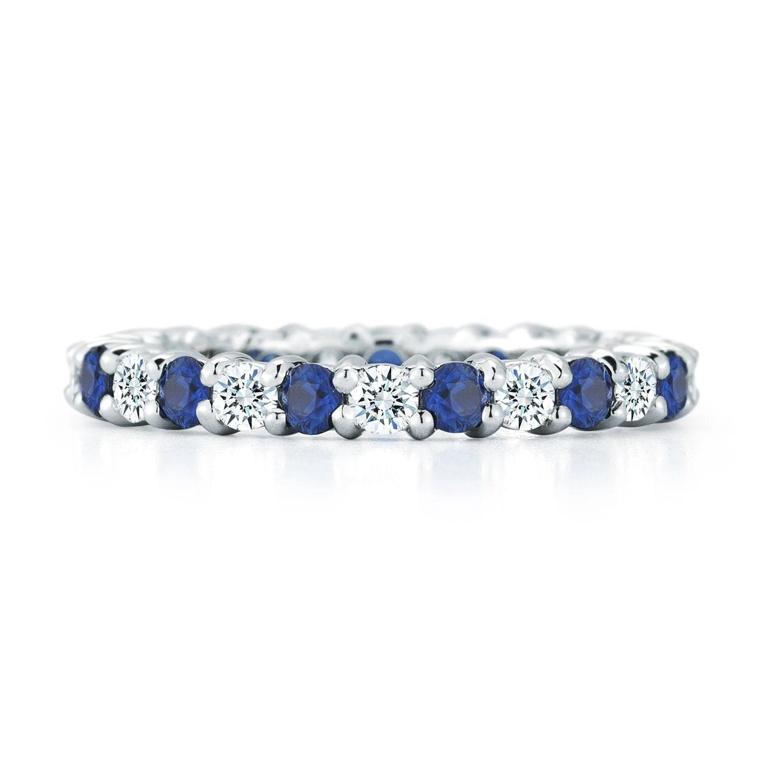 Platinum shared prong eternity band alternating with round blue sapphires and diamonds.