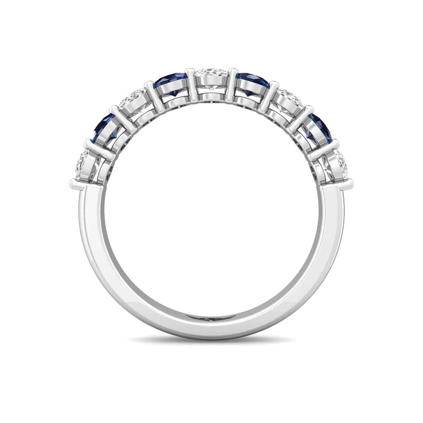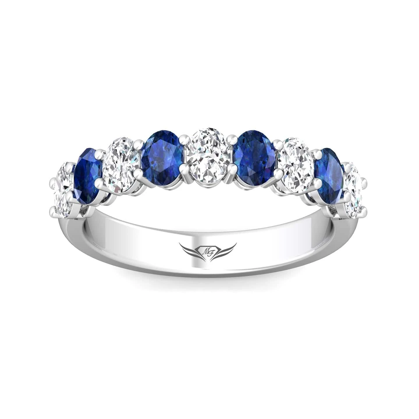 Platinum shared prong band with 4 oval blue sapphires and 5 oval diamonds set east to west.