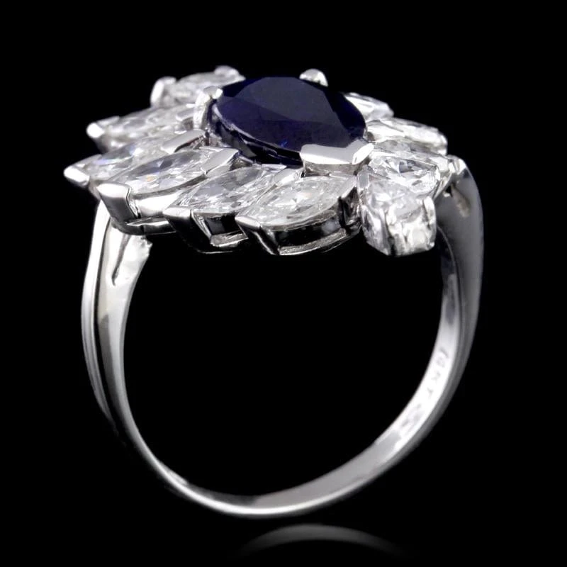 - Framed by ten marquise cut and two pear shaped diamonds