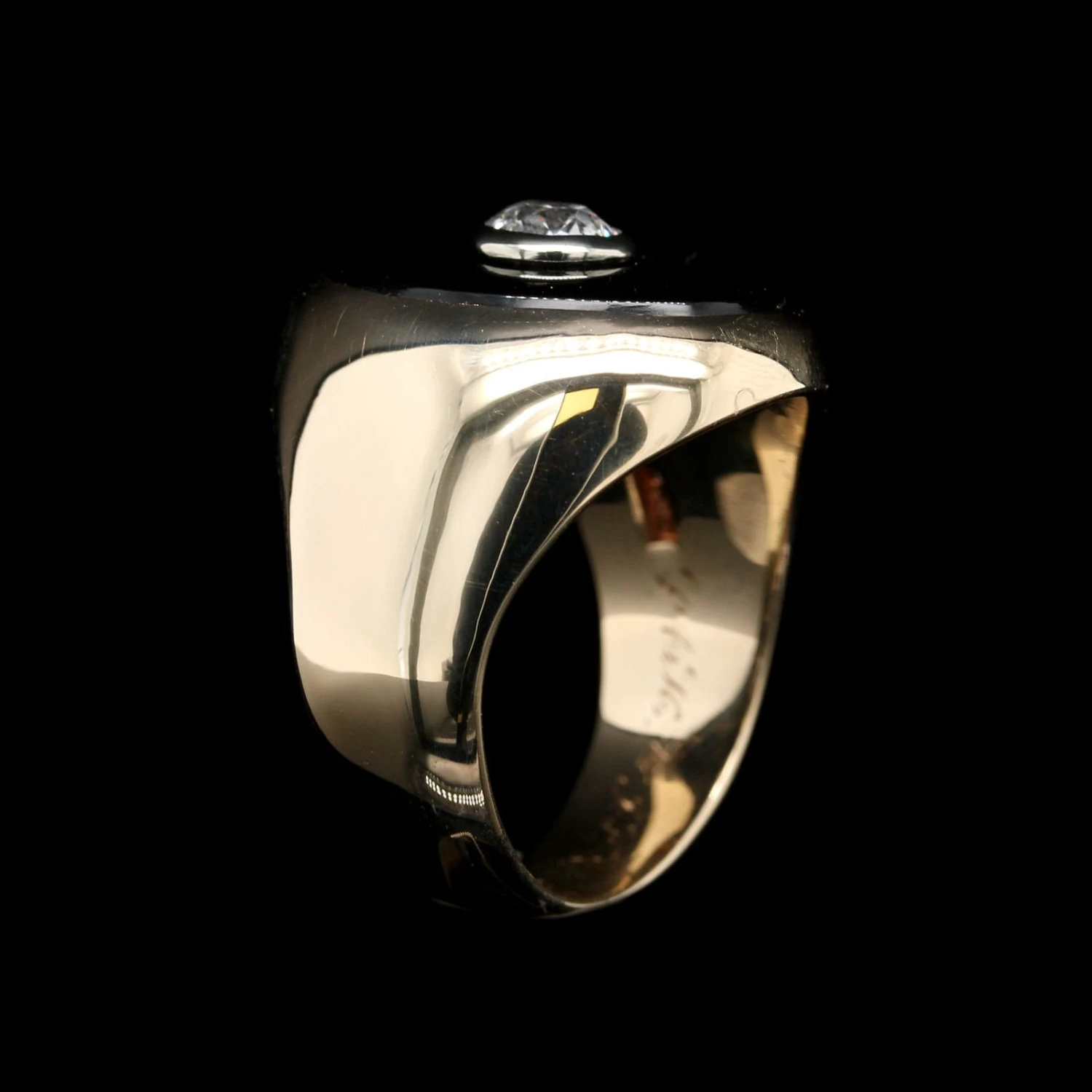 - The ring is set with one oval shaped onyx and one old European cut diamond